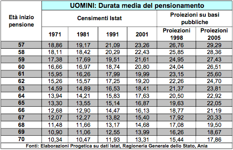 Questa tabella mostra un esempio dell’allungamento della “durata della pensione” per un uomo italiano in base alle diverse rilevazioni statistiche pubbliche. Se negli anni Settanta mediamente si andava in pensione a 65 anni con una attesa di vita media di oltre 13, oggi si va mediamente in pensione a 60 anni e questo comporta mediamente più di 26 anni di vita in pensione.
